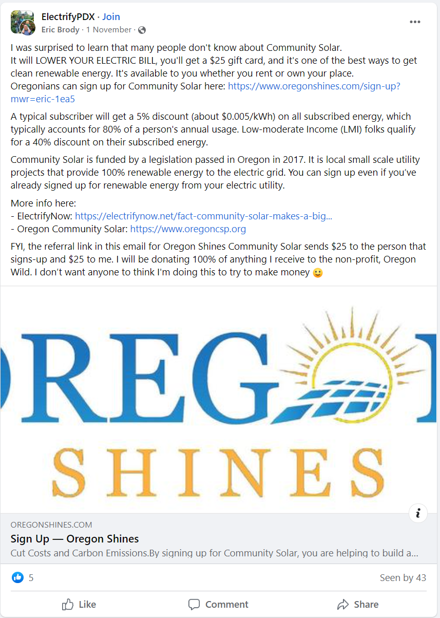 Oregon Shines maintains an active social presence on Facebook and LinkedIn to promote their core business, the Community Solar project. Several tactics such as adding links to posts, consistent engagement with the audience, using content techniques to encourage click-throughs, etc, have successfully led to improved traffic to the Oregon Shines website.