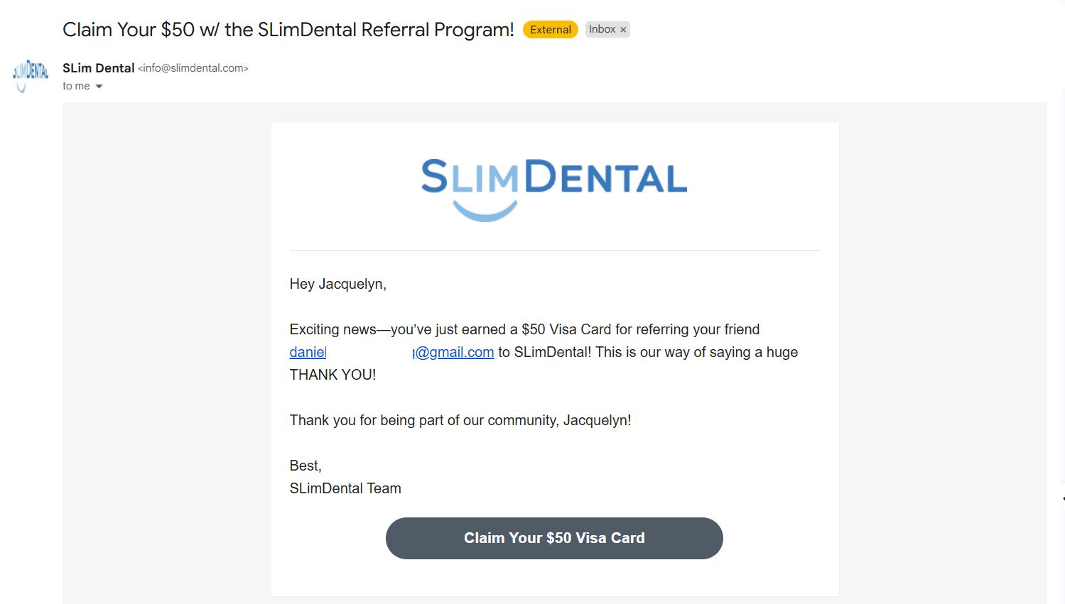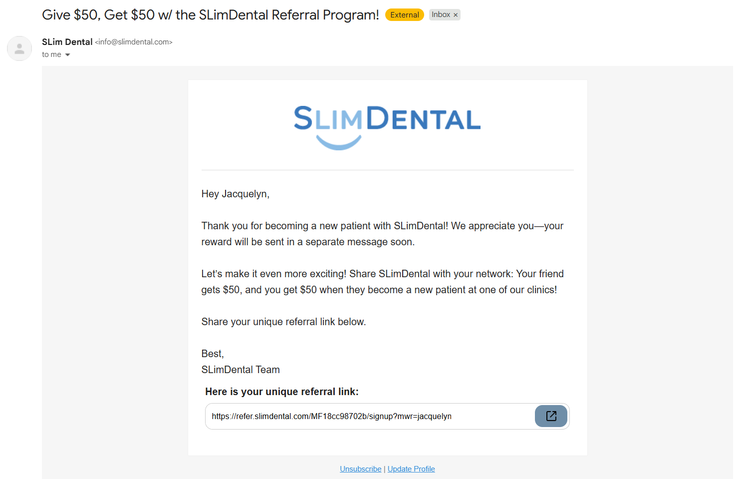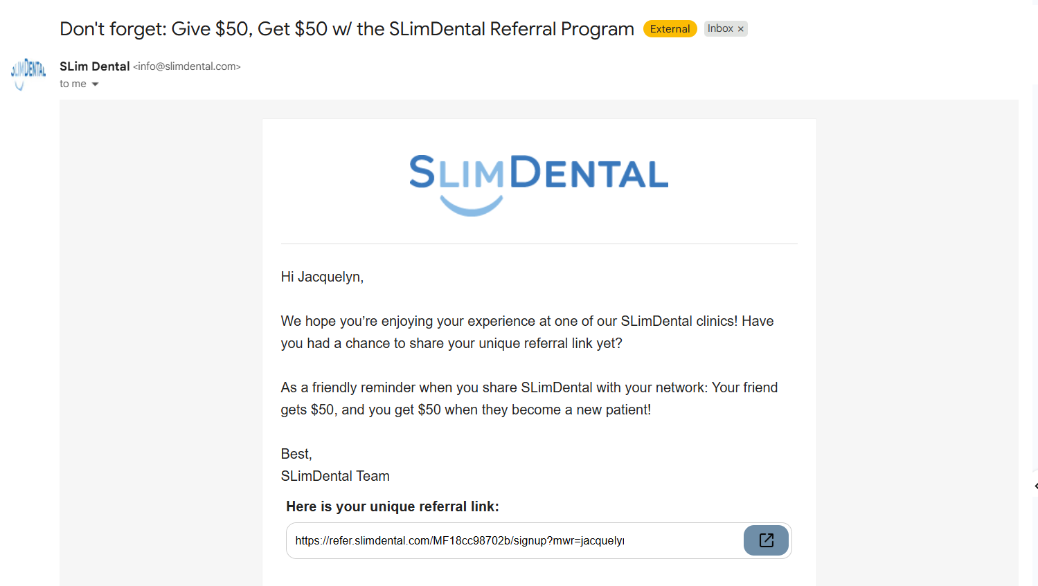 “Give $50, Get $50 with the SlimDental Referral Program. Your friend gets $50, and you get $50 when they become a new patient at one of our clinics!”