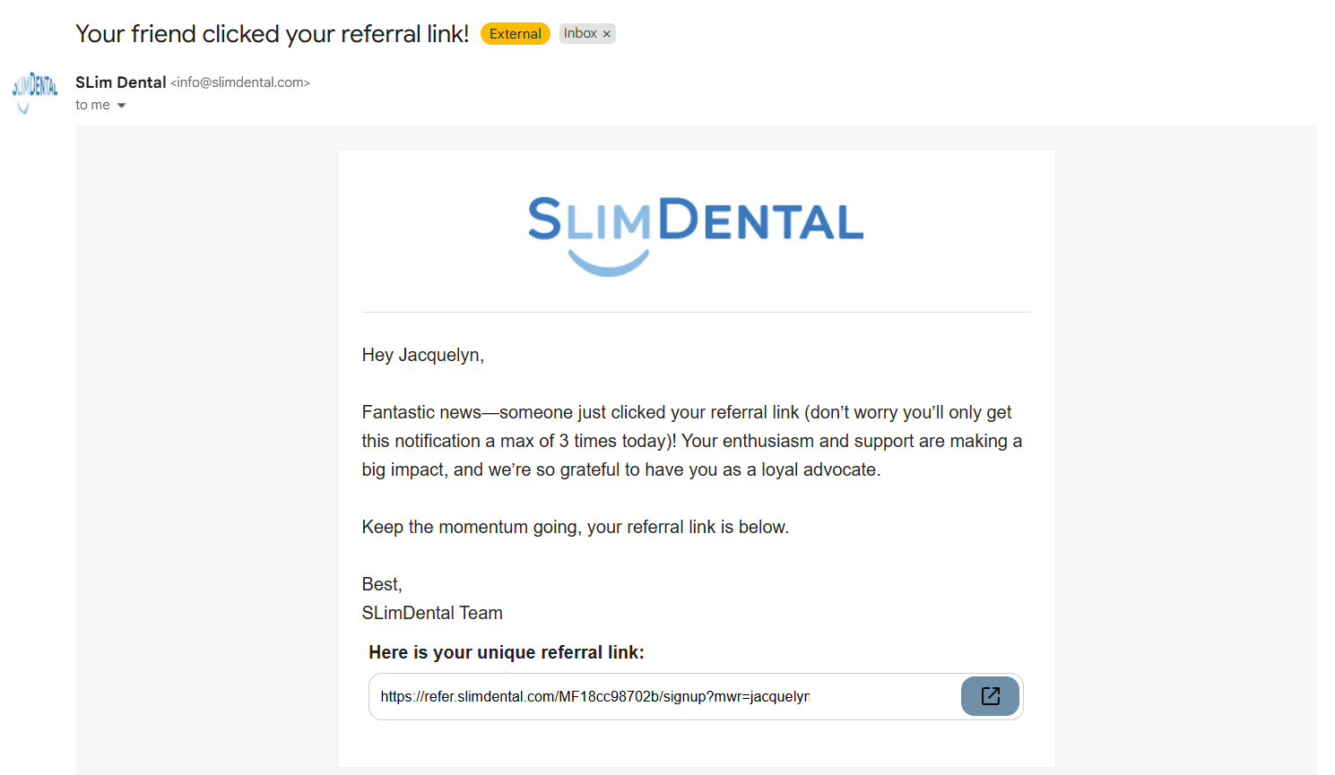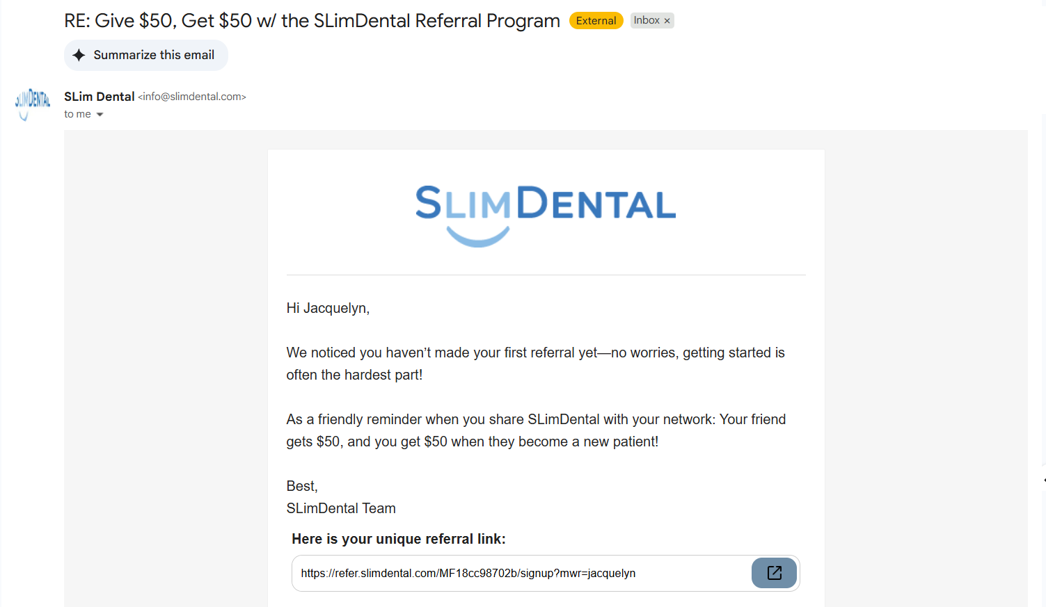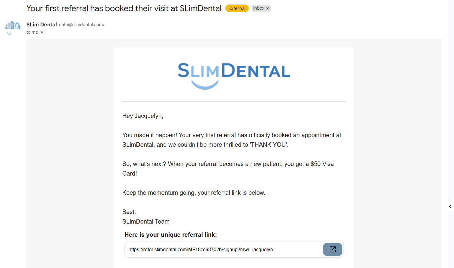 The solution was a referral program that rewarded patients for spreading the word while fostering a sense of community around the practice. By making referrals simple and rewarding, SlimDental didn’t just bring in new patients—it created a system where recommending great care became a natural extension of the patient journey.